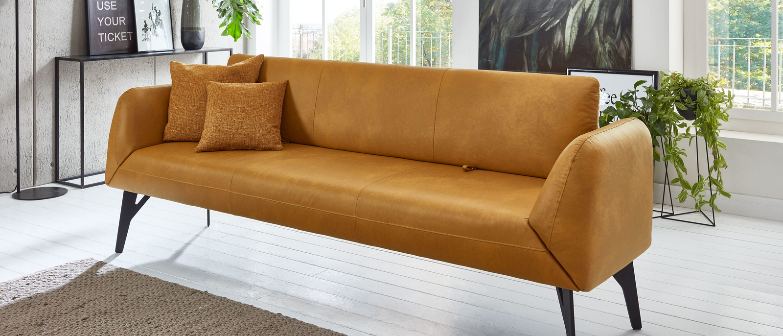 Sie setzt sich aus einem schwarz pulverbeschichteten Metallgestell mit Struktur und einem curcumafarbenen Lederbezug zusammen. Dank der perfekt aufeinander abgestimmten Materialien und Farben erscheint die Dinerbank absolut harmonisch und modern. Des Weiteren sorgen die geradlinige Formensprache, der hinten ebenfalls lederbezogene Rücken und die schicken Zierkappnähte für besonders nobles Flair.