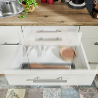 | Schubkasten | seidenweiß I gerade Zarge, Vollauszug mit Servosoft, automatische Zuhaltung, Selbsteinzug auf den letzten Zentimetern, stabiler 16 mm Schubkastenboden, exakte 3 dimensionale Justierbarkeit der Frontblende |